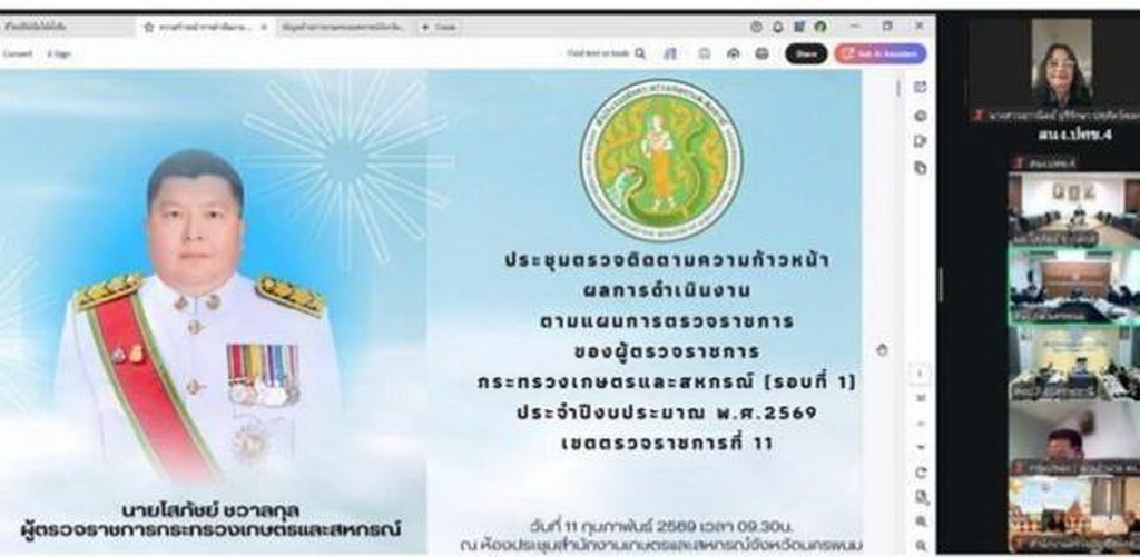 วันที่ 11 กุมภาพันธ์ 2569 เวลา 09.30 - 12.00 น. น.ส.เยาวนิตย์ บุรีรักษา ปศุสัตว์เขต 4 ในฐานะผู้ช่วยผู้ตรวจราชการกระทรวงเกษตรและสหกรณ์ ร่วมประชุมตรวจติดตามความก้าวหน้าผลการดำเนินงานตามแผนการตรวจราชการ ของผู้ตรวจราชการกระทรวงเกษตรและสหกรณ์ ประจำปีงบประมาณ พ.ศ. 2569 รอบที่ 1 เขตตรวจราชการที่ 11 (จังหวัดนครพนม) โดยการประชุมทางไกลผ่านสื่ออิเล็กทรอนิกส์ระบบออนไลน์ Web Conference Zoom Meeting โดยมี นายโสภัชย์ ชวาลกุล ผู้ตรวจราชการกระทรวงเกษตรและสหกรณ์ เขตตรวจราชการที่ 11 เป็นประธานการประชุม