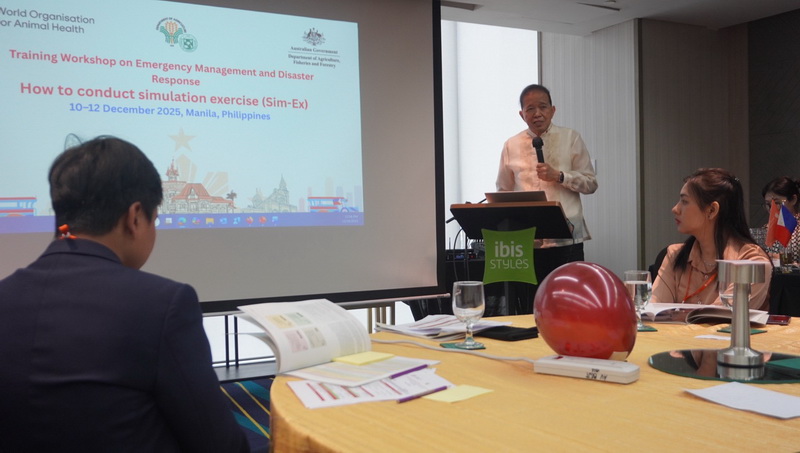 วันที่ 10-12 ธันวาคม 2568 นางสาวเยาวนิตย์ บุรีรักษา มอบหมายให้ สัตวแพทย์หญิง ดร. อรพรรณ อาจคำภา นายสัตวแพทย์ชำนาญการพิเศษ ส่วนสุขภาพสัตว์ สำนักงานปศุสัตว์เขต 4 ร่วมการอบรมเชิงปฎิบัติการเกี่ยวกับการจัดการภาวะฉุกเฉินและการตอบโต้ต่อภัยพิบัติเรื่อง How to conduct simulation exercise (Sim-Ex) โดยมีวัตถุประสงค์เพื่อเสริมสร้างความรู้และความร่วมมือในการซ้อมสถานการณ์จำลอง หรือการฝึกซ้อมเชิงปฏิบัติการโดยใช้สถานการณ์เสมือนจริง เพื่อทดสอบความพร้อมของระบบ บุคลากร ขั้นตอน และการประสานงานในด้านต่าง ๆ เพื่อเสริมความแข็งแกร่งแก่ระบบการป้องกันและความพร้อมรับมือเหตุฉุกเฉินที่อาจเกิดขึ้นในอนาคต ซึ่งการอบรมครั้งนี้จัดขึ้นโดยองค์การสุขภาพสัตว์โลก (WOAH) โดยมีตัวแทนจากประเทศในภูมิภาคเอเชียตะวันออกเฉียงใต้จำนวน 11 ประเทศเข้าร่วมการอบรม ณ กรุงมะนิลา ประเทศฟิลิปปินส์