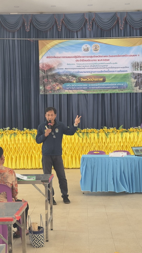 วันที่ 8 เมษายน 2569 นางสาวเยาวนิตย์ บุรีรักษา ปศุสัตว์เขต 4 มอบหมายให้ส่วนมาตรฐานการปศุสัตว์ และส่วนสุขภาพสัตว์ ร่วมเป็นวิทยากรให้กับกลุ่มจังหวัดสบายดี หลักสูตร ”การพัฒนามาตรฐานการผลิตโคเนื้อและการส่งออก“ โครงการพัฒนาการแปรรูปเพิ่มมูลค่าสินค้าเกษตรทั้งกลุ่มพืช ปศุสัตว์ และประมง เพื่อพัฒนาสู่สินค้าเกษตรมูลค่าสูง กิจกรรมพัฒนามาตรฐานการผลิตโคเนื้อ การแปรรูปผลิตภัณฑ์ และสร้างมูลค่าเนื้อโคขุนคุณภาพลุ่มน้ำโขง รุ่นที่ 10 จำนวนผู้เข้ารับการอบรม จำนวน 170 คน ณ หอประชุมที่ว่าการอำเภอเซกา อ.เซกา จ.บึงกาฬ ทั้งนี้เพื่อเตรียมความพร้อมผู้ประกอบการฟาร์มโคเนื้อสู่การผลิตเพื่อการส่งออก และปรับปรุงการเลี้ยงโคเนื้อได้อย่างมีประสิทธิภาพยิ่งขึ้นต่อไป