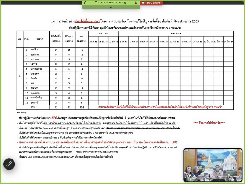 วันที่ 17 พฤศจิกายน 2568 เวลา 09.30-12.00 น. นางสาวเยาวนิตย์ บุรีรักษา ปศุสัตว์เขต 4 มอบหมายให้เจ้าหน้าที่ส่วนมาตรฐานการปศุสัตว์ สำนักงานปศุสัตว์เขต 4 จัดการประชุมซักซ้อมแผนการเก็บตัวอย่างงานด้านมาตรฐานสินค้าปศุสัตว์ ประจำปีงบประมาณ พ.ศ. 2569 ณ ห้องประชุมพระลับ สำนักงานปศุสัตว์เขต 4 ตำบลท่าพระ อำเภอเมืองขอนแก่น จังหวัดขอนแก่น ผ่านระบบการประชุมทางไกล (Zoom meeting) โดยมีเจ้าหน้าที่จากศูนย์วิจัยและพัฒนาการสัตวแพทย์ภาคตะวันออกเฉียงเหนือตอนบน (ขอนแก่น) เข้าร่วมชี้แจงแผนการเก็บตัวอย่างฯให้กับเจ้าหน้าที่กลุ่มพัฒนาคุณภาพสินค้าปศุสัตว์จากสำนักงานปศุสัตว์จังหวัดทุกจังหวัดในพื้นที่รับผิดชอบของสำนักงานปศุสัตว์เขต 4 ทราบและถือเป็นแนวทางในการปฏิบัติงานต่อไป