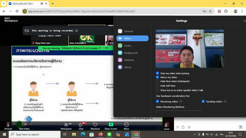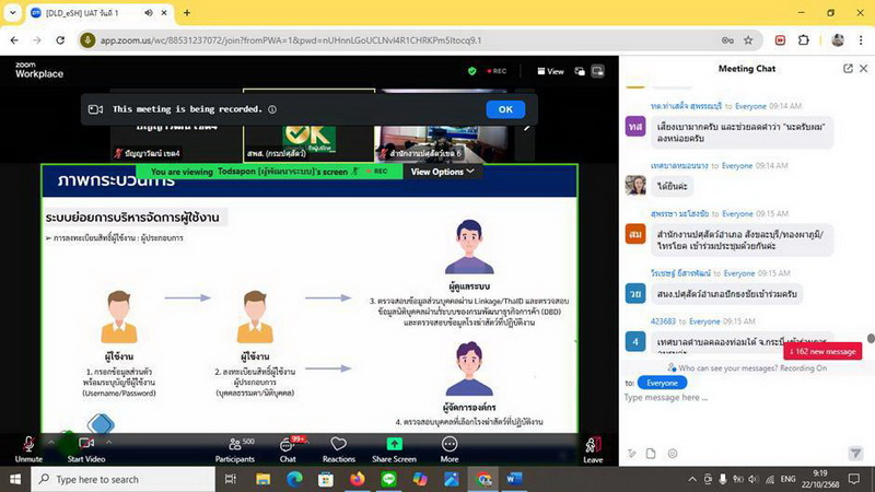 วันที่ 22 ตุลาคม 2568 เวลา 09.00 น. นางสาวเยาวนิตย์ บุรีรักษา ปศุสัตว์เขต 4 มอบหมายให้เจ้าหน้าที่ส่วนมาตรฐานการปศุสัตว์ สำนักงานปศุสัตว์เขต 4 เข้าร่วมการประชุมทดสอบการใช้ระบบการให้บริการอนุญาตและกำกับดูแลการประกอบกิจการฆ่าสัตว์ ผ่านระบบการประชุม ทางไกล (Zoom meeting) จัดโดยสำนักพัฒนาระบบและรับรอง มาตรฐานสินค้าปศุสัตว์ เพื่อซักซ้อมความเข้าใจให้กับเจ้าหน้าที่ผู้ปฏิบัติงานทั้งในสังกัดกรมปศุสัตว์และ องค์กรปกครองส่วนท้องถิ่นทั่วประเทศ