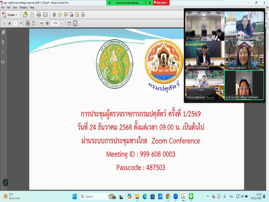 วันพุธที่ 24 ธันวาคม 2568 นางสาวเยาวนิตย์ บุรีรักษา ปศุสัตว์เขต 4 พร้อมด้วยส่วนสุขภาพสัตว์ และส่วนยุทธศาสตร์และสารสนเทศการปศุสัตว์ เข้าร่วมประชุมผู้ตรวจราชการกรมปศุสัตว์ ครั้งที่ 1/2569 ผ่านการประชุมทางไกล Zoom Conference Meeting เพื่อวางแนวทางการตรวจราชการของผู้ตรวจราชการกรมปศุสัตว์ และแนวทางแก้ไขปัญหาอุปสรรคในการปฏิบัติงาน เพื่อให้การดำเนินงานของผู้ตรวจราชการกรมปศุสัตว์ ประจำปีงบประมาณ พ.ศ. 2569 เป็นไปในทิศทางเดียวกัน บรรลุวัตถุประสงค์ และเป้าหมายตามที่กระทรวงเกษตรและสหกรณ์ และกรมปศุสัตว์กำหนด ณ ห้องประชุมพระลับ สำนักงานปศุสัตว์เขต 4 ตำบลท่าพระ อำเภอเมือง จังหวัดขอนแก่น โดยมีนายยุษฐิระ บัณฑุกุล ปศุสัตว์เขต 7 เป็นประธานการประชุม ผู้เข้าร่วมประชุม จำนวน 46 คน ประกอบด้วย ปศุสัตว์เขต 1 - 9, ผู้อำนวยการสำนักควบคุม ป้องกัน และบำบัดโรคสัตว์, สำนักกฎหมาย, สำนักพัฒนาระบบมาตราฐานสินค้าปศุสัตว์, กองแผนงาน, กองสารวัตรและกักกัน และ ผอ.ส่วนยุทธศาสตร์และสารสนเทศการปศุสัตว์ สำนักงานปศุสัตว์เขต 1 - 9
