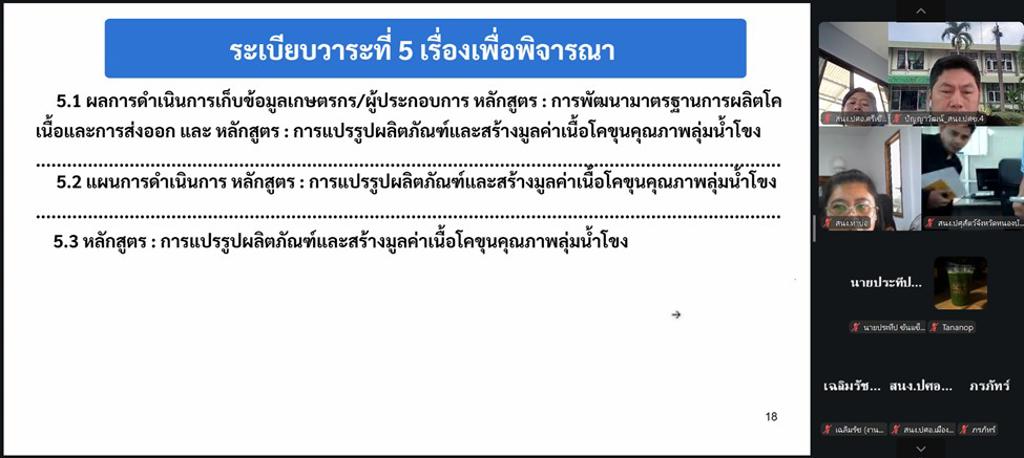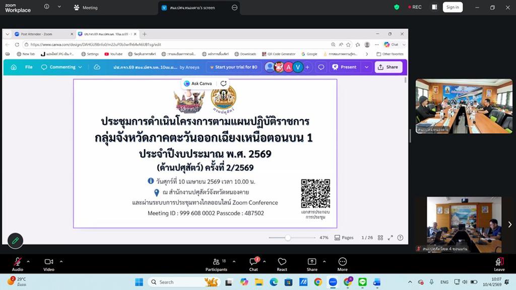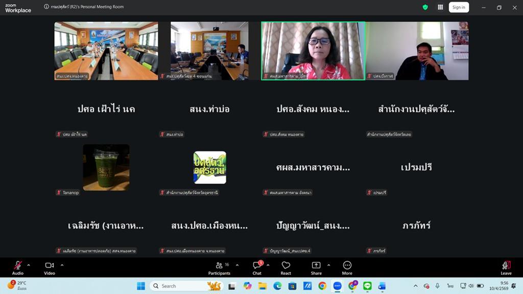 วันศุกร์ที่ 10 เมษายน 2569 เวลา 10.00 น. นางสาวเยาวนิตย์ บุรีรักษา ปศุสัตว์เขต 4 มอบหมายให้เจ้าหน้าที่ส่วนสุขภาพสัตว์ ส่วนมาตรฐานการปศุสัตว์ และส่วนยุทธศาสตร์และสารสนเทศการปศุสัตว์ สำนักงานปศุสัตว์เขต 4 เข้าร่วมประชุมการดำเนินโครงการตามแผนปฏิบัติราชการกลุ่มจังหวัดภาคตะวันออกเฉียงเหนือตอนบน 1 ประจำปีงบประมาณ พ.ศ. 2569 (ด้านปศุสัตว์) ครั้งที่ 2 /2569 โครงการพัฒนาการแปรรูปเพิ่มมูลค่าสินค้าเกษตรทั้งกลุ่มพืช ปศุสัตว์ และประมง เพื่อสู่สินค้าเกษตรมูลค่าสูง กิจกรรมพัฒนามาตรฐานการผลิตโคเนื้อ การแปรรูปผลิตภัณฑ์และสร้างมูลค่าเนื้อโคขุนคุณภาพลุ่มน้้ำโขง ผ่านการประชุมทางไกลออนไลน์ (Zoom Conference) โดยมีนายฉัตรชัย ประทุมมาลย์ ปศุสัตว์จังหวัดหนองคาย เป็นประธานการประชุมครั้งนี้