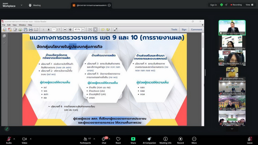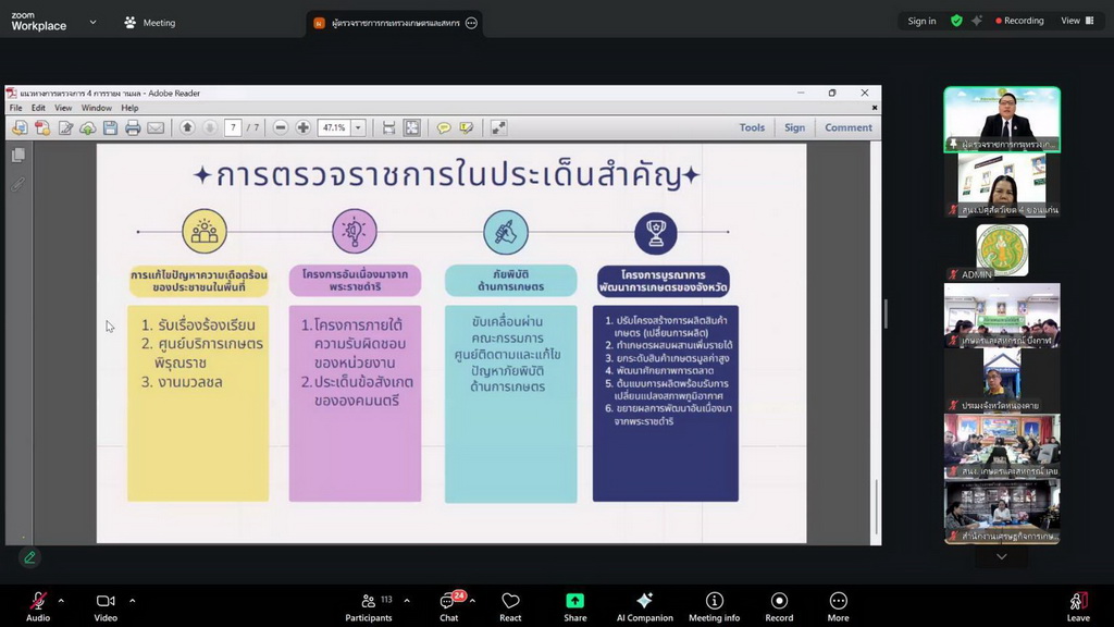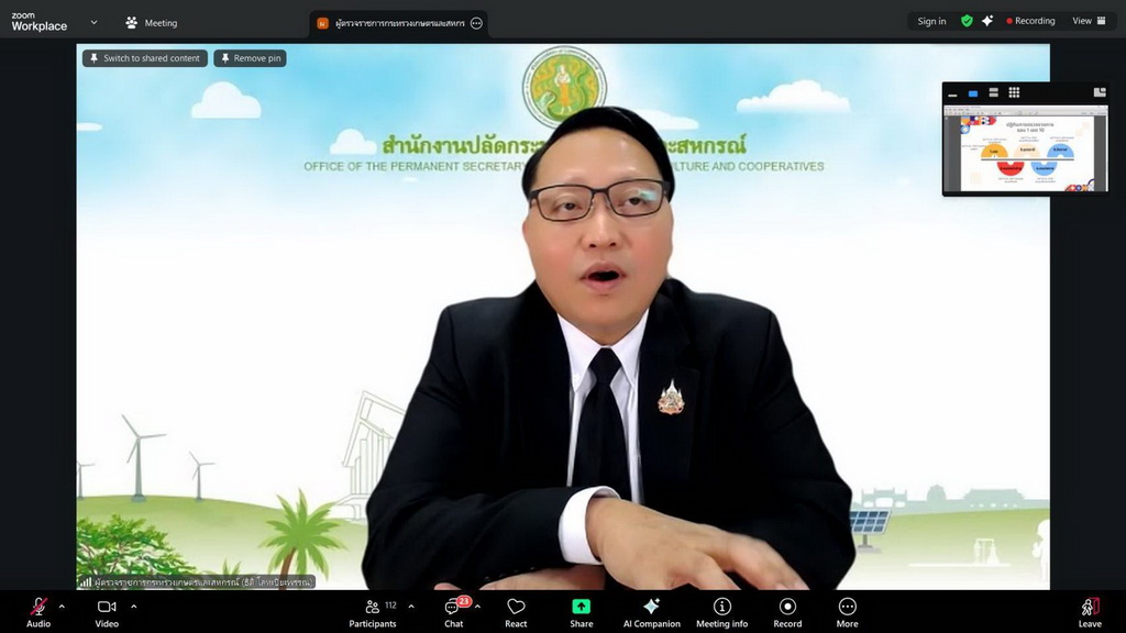วันที่ 12 กุมภาพันธ์ 2569 เวลา 13.30 - 15.30 น. น.ส.เยาวนิตย์ บุรีรักษา ปศุสัตว์เขต 4 มอบหมายให้เจ้าหน้าที่ส่วนยุทธศาสตร์และสารสนเทศการปศุสัตว์ สำนักงานปศุสัตว์เขต 4 เข้าร่วมการประชุมชี้แจงแนวทางการตรวจราชการ ของผู้ตรวจราชการกระทรวงเกษตรและสหกรณ์ ประจำปีงบประมาณ พ.ศ. 2569 เขตตรวจราชการที่ 10 (จังหวัดเลย หนองบัวลำภู อุดรธานี หนองคาย และบึงกาฬ) ผ่านระบบประชุมทางไกล Zoom Meeting โดยมี นายธิติ โลหะปิยะพรรณ ผู้ตรวจราชการกระทรวงเกษตรและสหกรณ์ เขตตรวจราชการที่ 10 เป็นประธานการประชุม