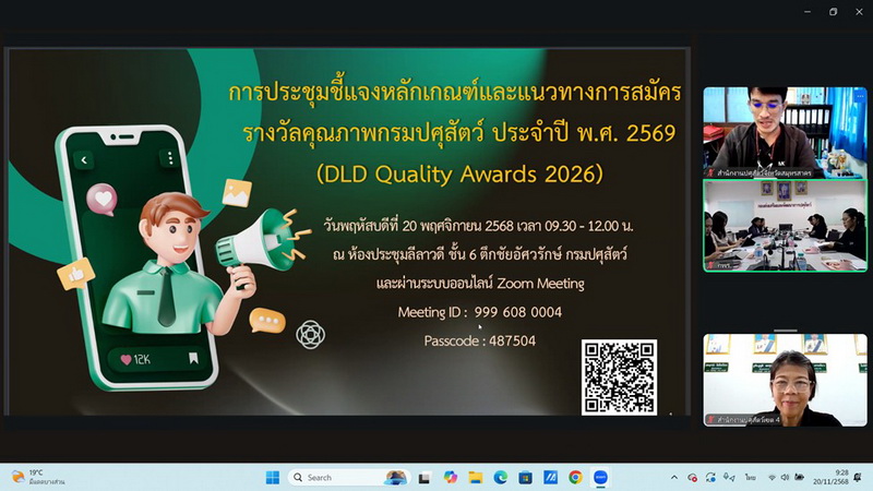 วันที่ 20 พฤศจิกายน 2568 เวลา 09.30 - 12.00 น. นางสาวเยาวนิตย์ บุรีรักษา ปศุสัตว์เขต 4 มอบหมายให้ส่วนยุทธศาสตร์และสารสนเทศการปศุสัตว์ สำนักงานปศุสัตว์เขต 4 เข้าร่วมการประชุมชี้แจงหลักเกณฑ์และแนวทางการสมัครรางวัลคุณภาพกรมปศุสัตว์ ประจำปี พ.ศ. 2569 (DLD Quality Awards 2026) ณ ห้องประชุมสำนักงานปศุสัตว์เขต 4 ตำบลท่าพระ อำเภอเมืองขอนแก่น จังหวัดขอนแก่น ผ่านระบบการประขุมทางไกล (Zoom Meeting) เพื่อสร้างความรู้ความเข้าใจในหลักเกณฑ์การรับสมัครรางวัลฯ