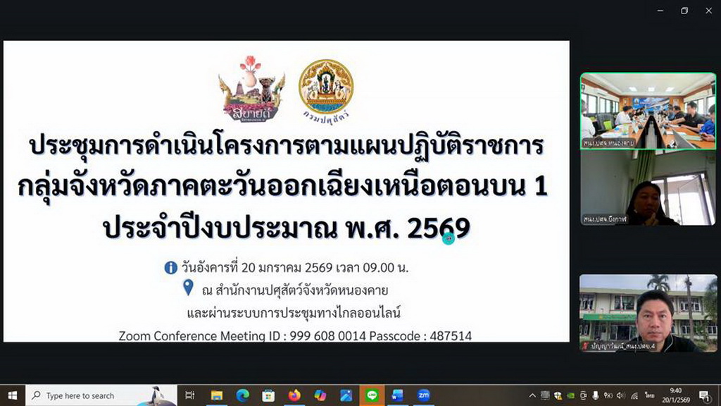 วันอังคารที่ 20 มกราคม 2569 เวลา 09.00 น. นางสาวเยาวนิตย์ บุรีรักษา ปศุสัตว์เขต 4 มอบหมายให้เจ้าหน้าที่ส่วนสุขภาพสัตว์ ส่วนมาตรฐานการปศุสัตว์ และส่วนยุทธศาสตร์และสารสนเทศการปศุสัตว์ สำนักงานปศุสัตว์เขต 4 เข้าร่วมประชุมการดำเนินโครงการตามแผนปฏิบัติราชการกลุ่มจังหวัดภาคตะวันออกเฉียงเหนือตอนบน 1 ประจำปีงบประมาณ พ.ศ. 2569 โครงการพัฒนาการแปรรูปเพิ่มมูลค่าสินค้าเกษตรทั้งกลุ่มพืช ปศุสัตว์ และประมง เพื่อสู่สินค้าเกษตรมูลค่าสูง กิจกรรมพัฒนามาตรฐานการผลิตโคเนื้อ การแปรรูปผลิตภัณฑ์และสร้างมูลค่าเนื้อโคขุนคุณภาพลุ่มน้้ำโขง ผ่านการประชุมทางไกลออนไลน์ (Zoom Conference) โดยมีนายคมวุฒิ ธรรมสาร์ นายสัตวแพทย์ชำนาญการพิเศษ รักษาราชการแทนปศุสัตว์จังหวัดหนองคาย เป็นประธานการประชุม