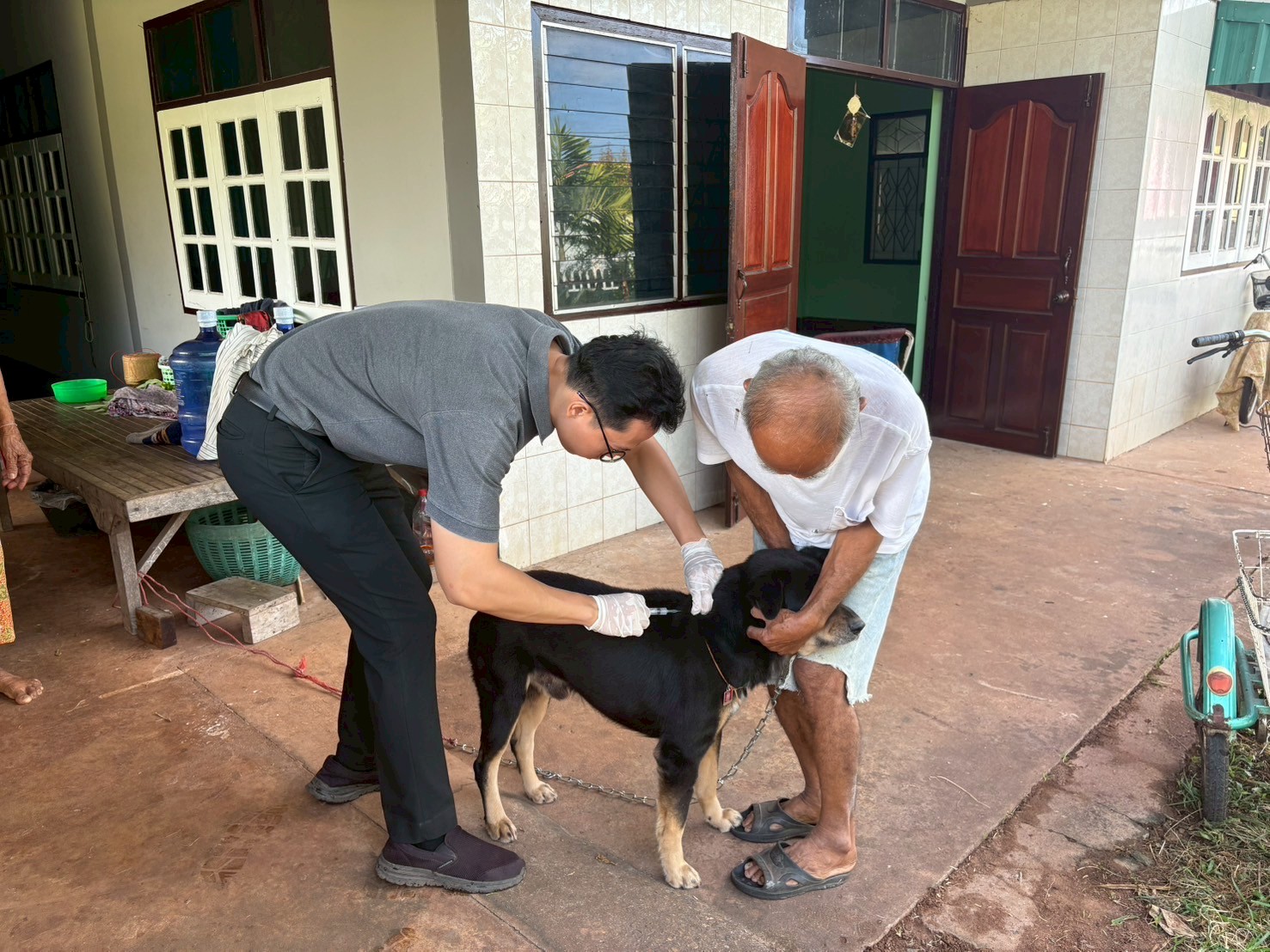 วันที่ 30 ตุลาคม 2568 ปศุสัตว์จังหวัดหนองคาย มอบหมายให้ กลุ่มพัฒนาสุขภาพสัตว์ ร่วมกับสำนักงานปศุสัตว์อำเภอเมืองหนองคาย ลงพื้นที่ออกให้บริการฉีดวัคซีนป้องกันโรคพิษสุนัขบ้าให้แก่สุนัขและแมว ในพื้นที่ชุมชนบ้านคำแค หมู่ที่ 2 และบ้านร่องเม็ก หมู่ที่ 7 ตำบลโพธิ์ชัย อำเภอเมืองหนองคาย จังหวัดหนองคาย เพื่อควบคุมและป้องกันการแพร่ระบาดของโรคพิษสุนัขบ้าในชุมชน โดยมีผู้นำสัตว์เลี้ยงมารับการฉีดวัคซีน จำนวน 68 ราย สัตว์เลี้ยงจำนวน 248 ตัว เป็น สุนัข จำนวน 187 ตัว แมว จำนวน 61 ตัว