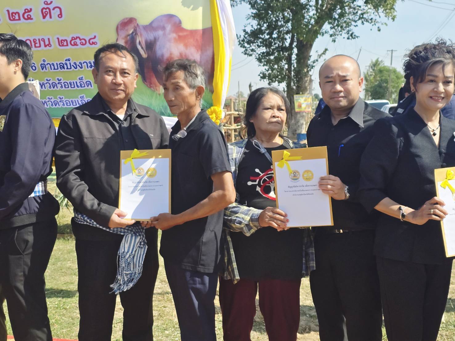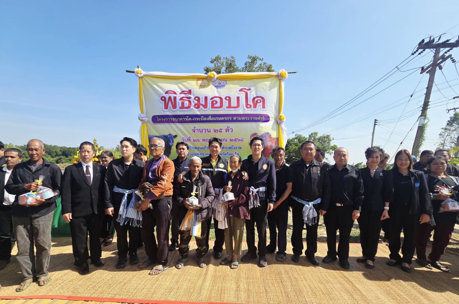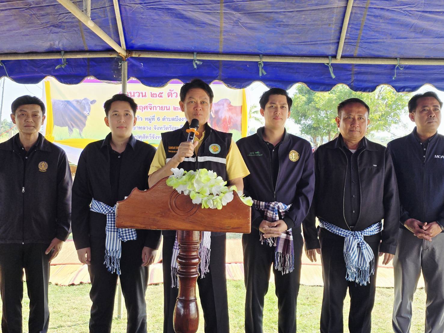 วันที่ 26 พฤศจิกายน 2568 นายอำนาจ มะธิปิไข ปศุสัตว์จังหวัดร้อยเอ็ด พร้อมด้วยนายอิทธิพัทธ์ จำรัสบุญหิรัญ ผู้อำนวยการส่วนส่งเสริมและพัฒนาการปศุสัตว์แทนปศุสัตว์เขต 4 กลุ่มส่งเสริมและพัฒนาการปศุสัตว์ สำนักงานปศุสัตว์อำเภอทุ่งเขาหลวง ร่วมจัดพิธีมอบโค โครงการธนาคารโค-กระบือเพื่อเกษตรกร ตามพระราชดำริ มอบโคทั้งหมดจำนวน 25 ตัว มอบเวชภัณฑ์จำนวน 25 ชุด โดยมี ดร.เอกภาพ พลซื่อ โฆษกกระทรวงเกษตรและสหกรณ์ เป็นประธานในพิธี มีหน่วยงานสังกัดกระทรวงเกษตรและสหกรณ์เข้าร่วมพิธีฯ ณ บ้านดอนแก้ว หมู่ที่ 6 ตำบลบึงงาม อำเภอทุ่งเขาหลวง จังหวัดร้อยเอ็ด