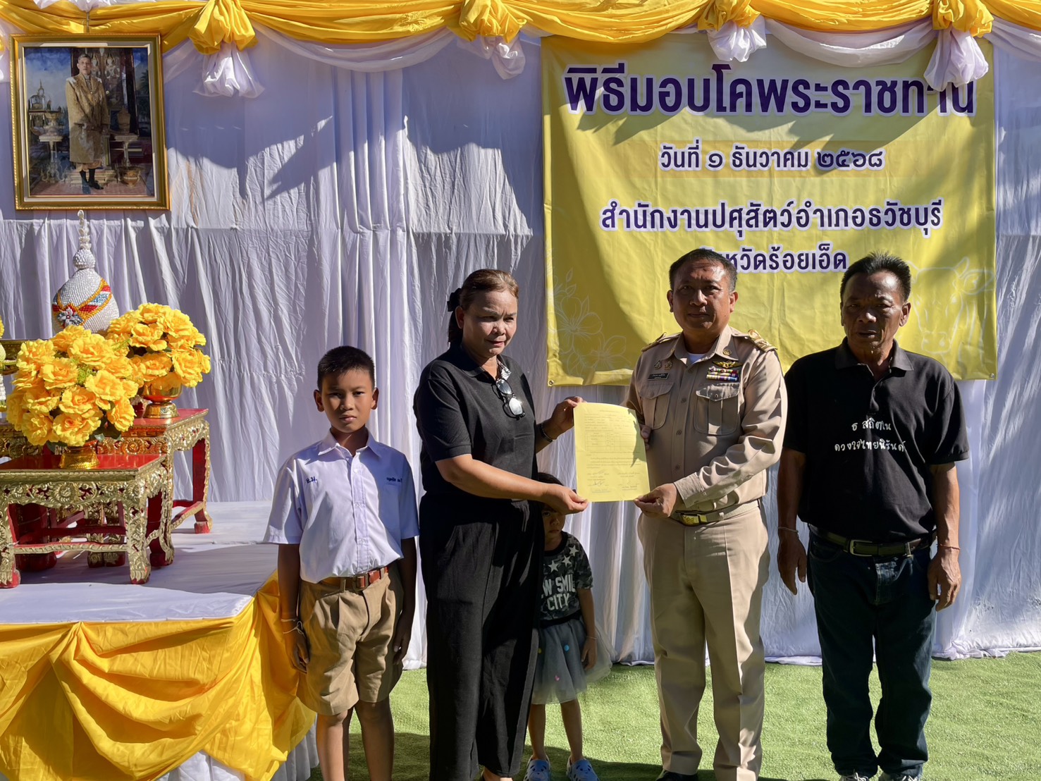 ด้วยพระบาทสมเด็จพระเจ้าอยู่หัว พระราชทานปล่อยชีวิตโคเพศผู้ 1 ตัว เพศเมีย 1 ตัว เพื่อนำไปมอบให้แก่เกษตรกรในพื้นที่อำเภอธวัชบุรี จังหวัดร้อยเอ็ด ได้แก่ นางบานเย็น มะโนศรี บ้านเลขที่141 หมู่ที่5 บ้านจันทร์สว่าง ตำบลอุ่มเม้า อำเภอธวัชบุรี จังหวัดร้อยเอ็ด
