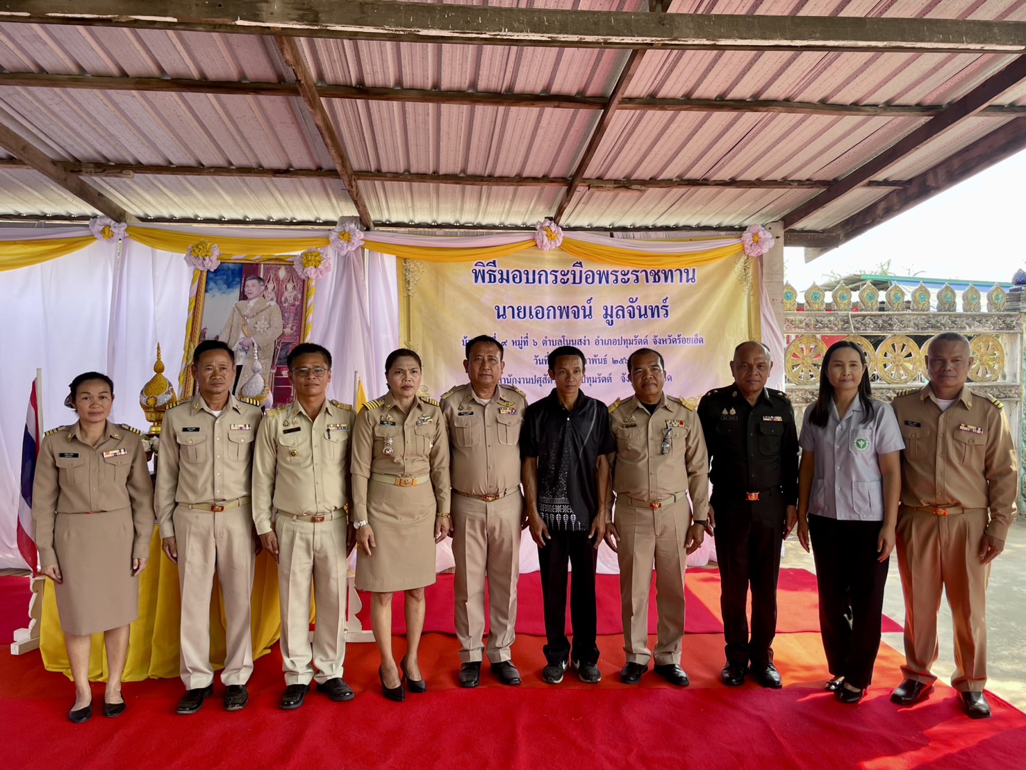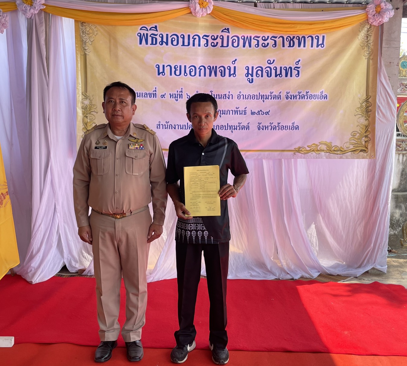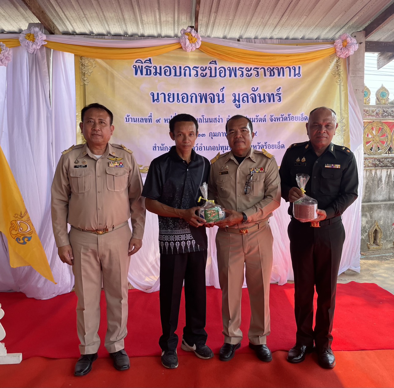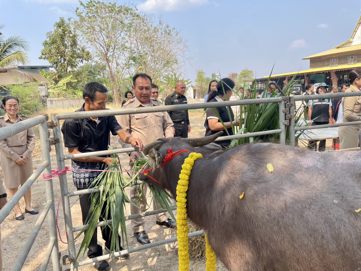 วันที่ 23 กุมภาพันธ์ 2569 เวลา 13.30 น. นายอำนาจ มะธิปิไข ปศุสัตว์จังหวัดร้อยเอ็ด พร้อมด้วยกลุ่มส่งเสริมและพัฒนาการปศุสัตว์ สำนักงานปศุสัตว์อำเภอปทุมรัตต์จัดพิธีมอบกระบือพระราชทาน ด้วยพระบาทสมเด็จพระเจ้าอยู่หัว พระราชทานปล่อยชีวิตกระบือเพศเมีย 1 คู่ เพื่อนำไปมอบให้แก่เกษตรกรในพื้นที่อำเภอปทุมรัตต์ จังหวัดร้อยเอ็ด ได้แก่นายเอกพจน์ มูลจันทร์ บ้านเลขที่ 9 หมู่ที่ 6 บ้านขนวน ตำบลโนนสง่า อำเภอปทุมรัตต์ จังหวัดร้อยเอ็ด