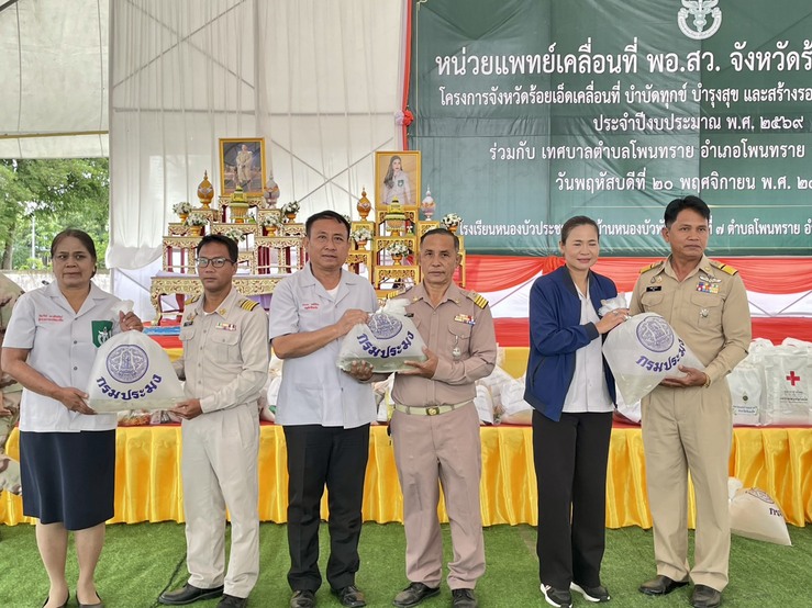 วันที่ 20 พฤศจิกายน 2568 นายอำนาจ มะธิปิไข ปศุสัตว์จังหวัดร้อยเอ็ด เข้าร่วมหน่วยแพทย์เคลื่อนที่ พอ.สว.จังหวัดร้อยเอ็ด ครั้งที่ 1 ร่วมกับโครงการจังหวัดร้อยเอ็ด เคลื่อนที่บำบัดทุกข์บำรุงสุข และสร้างรอยยิ้มให้ประชาชน ครั้งที่ 1 เพื่อนำกิจกรรมและเจ้าหน้าที่ที่เกี่ยวข้องออกให้บริการพบปะเยี่ยมเยือนรวมถึงการแก้ไขปัญหาความเดือดร้อน ทั้งนี้สำนักงานปศุสัตว์จังหวัด ได้ให้บริการผ่าตัด ทำหมันสุนัขและแมวจำนวน 64 ตัว และฉีดวัคซีนป้องกันโรคพิษสุนัขบ้าในสุนัข-แมว จำนวน 70 ตัว พร้อมทั้งมอบเวชภัณฑ์สำหรับสัตว์ โดยมี นางสาวปราณี วงศ์บุตร รองผู้ว่าราชการจังหวัดร้อยเอ็ด เป็นประธานในพิธี ณ โรงเรียนหนองบัวประชาสรรค์ บ้านหนองบัวพัฒนา หมู่ที่7 ตำบลโพนทราย อำเภอโพนทราย จังหวัดร้อยเอ็ด