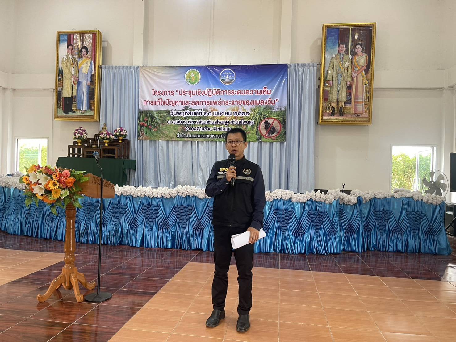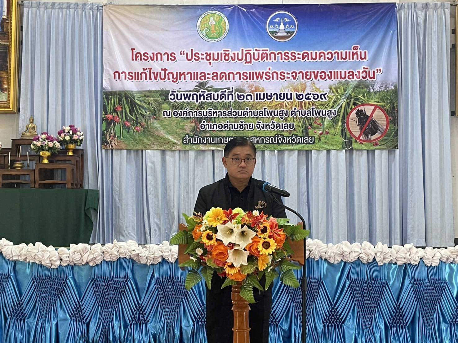 วันที่ 23 เมษายน 2569 นายอภิชัย นาคีสังข์ ปศุสัตว์จังหวัดเลย เข้าร่วมประชุมฯ พร้อมด้วยนายพิงพันธ์ เจริญสุระสถล หัวหน้ากลุ่มพัฒนาคุณภาพสินค้า และนางสาวบุญรักษา ขานอยู่ ตำแหน่ง นายสัตวแพทย์ปฏิบัติการ สำนักงานปศุสัตว์อำเภอด่านซ้าย เพื่อรับฟังความคิดเห็น ปัญหาอุปสรรค ความต้องการ และข้อเสนอแนะแนวทางการแก้ไขปัญหา และลดการแพร่กระจายของแมลงวัน พร้อมลงพื้นที่ตรวจเยี่ยมแปลงปลูกแก้วมังกรของเกษตรกรเพื่อศึกษาบริบทพื้นที่ โดยมีนายชัยพจน์ จรูญพงศ์ ผู้ว่าราชการจังหวัดเลย เป็นประธานในครั้งนี้ ณ องค์การบริหารส่วนตำบลโพนสูง ตำบลโพนสูง อำเภอด่านซ้าย จังหวัดเลย